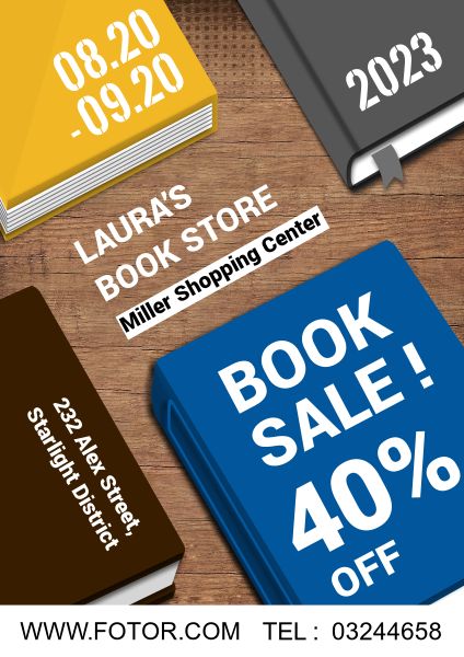 Fotor懒设计提供精美原创的书店打折英文海报英文海报设计模板,该英文海报作品是由Fotor懒设计英文海报设计师上传,尺寸为42cm × 59.4cm,点击“使用这个模板”后可以在线制作英文海报,文字图片背景皆可修改,3分钟即可在线高效完成英文海报设计,并能下载高清英文海报图片。