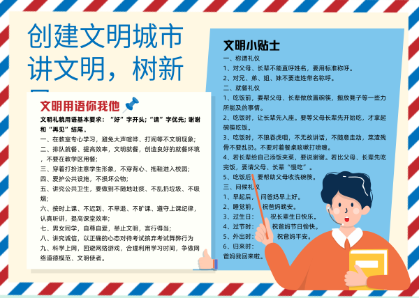 Fotor懒设计提供精美原创的蓝色矢量讲文明树新风文明城市手抄报设计模板,该手抄报作品是由Fotor懒设计手抄报设计师上传,尺寸为29.7cm*21cm,点击“使用这个模板”后可以在线制作手抄报,文字图片背景皆可修改,3分钟即可在线高效完成手抄报设计,并能下载高清手抄报图片。